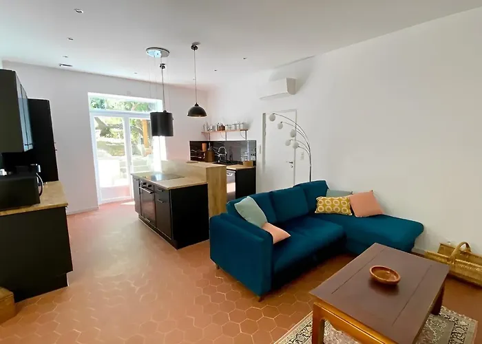 이 55m^2 아파트는 님-아레-캬망구-쎄베르 공항에서 15km 떨어져 있습니다. 일광판, 일광판, 정원도 포함되어 있습니다.